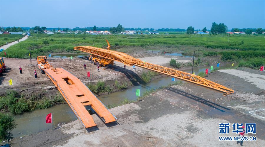 7月10日,工作人員在演練現(xiàn)場搭建機械化橋梁(無人機照片)。當日,由吉林省交通運輸廳主辦的公路橋梁水毀搶通應(yīng)急演練在長春市雙陽區(qū)雙陽河舉行,參與演練人員從汛情水毀信息報送、應(yīng)急裝備快速集結(jié)、機械化橋梁搶通搭設(shè)、善后處理等方面進行實戰(zhàn)演練。新華社記者張楠攝