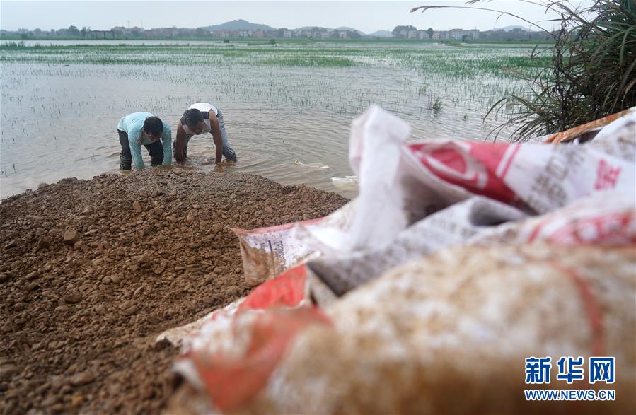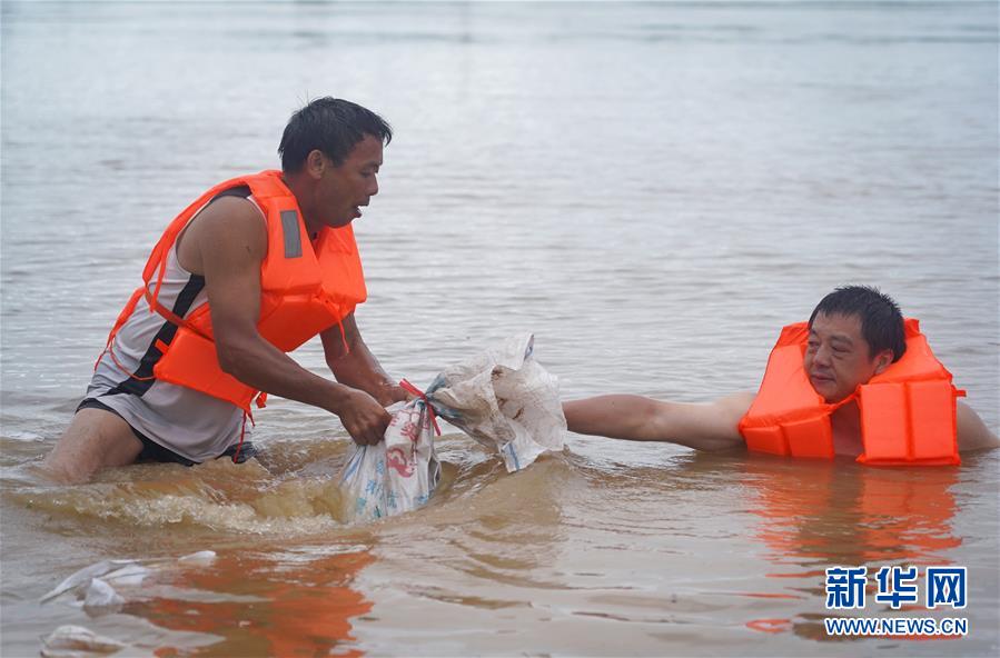 7月9日,為應(yīng)對(duì)洪峰到來(lái),邵忠如(左)在水中加固圩堤。新華社記者萬(wàn)象攝