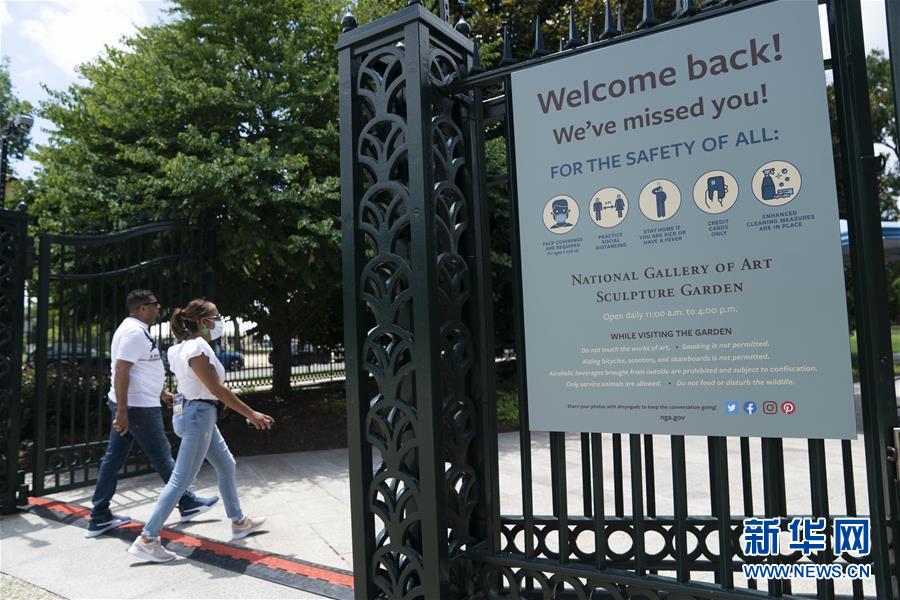 7月11日,人們?cè)诿绹?guó)華盛頓國(guó)家藝術(shù)畫廊雕塑公園游覽時(shí)經(jīng)過門口關(guān)于疫情防控的告示。新華社記者劉杰攝