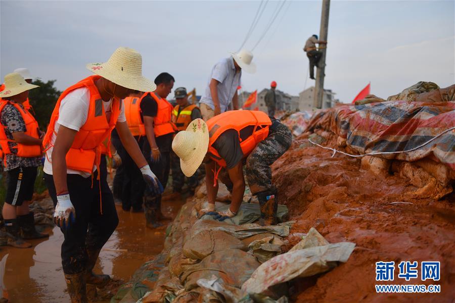 在江西鄱陽縣昌江圩,武警江西總隊機動支隊的工作人員和當(dāng)?shù)卮迕褚黄鸺庸疼椎蹋?月12日攝)。新華社記者 胡晨歡 攝