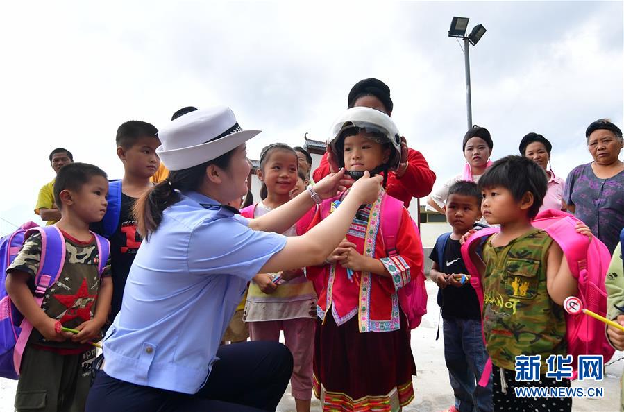 7月11日,柳州市交警支隊民警指導(dǎo)小朋友正確佩戴頭盔。當(dāng)日,廣西柳州市交警支隊的民警來到融水苗族自治縣大浪鎮(zhèn)大新村紅鄧屯教學(xué)點,開展暑期交通安全教育活動,增強孩子們的安全出行意識。新華社記者黃孝邦攝