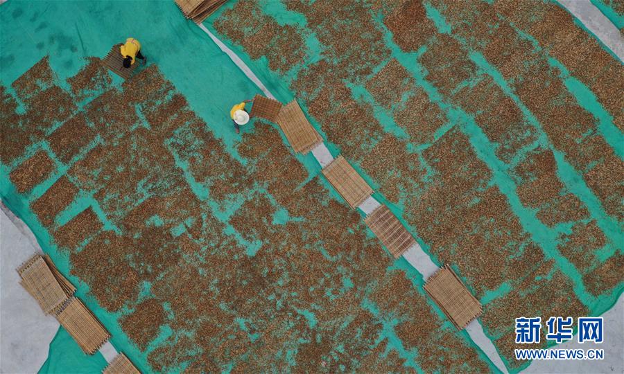 7月12日,祁東縣黃土鋪鎮(zhèn)雷公殿村,村民在晾曬黃花菜(無(wú)人機(jī)照片)。新華社記者 趙眾志 攝