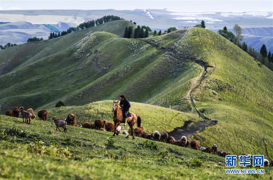 在新疆伊犁特克斯縣境內的夏牧場里,一位牧民在放牧(6月30日攝)。新華社記者 王菲 攝