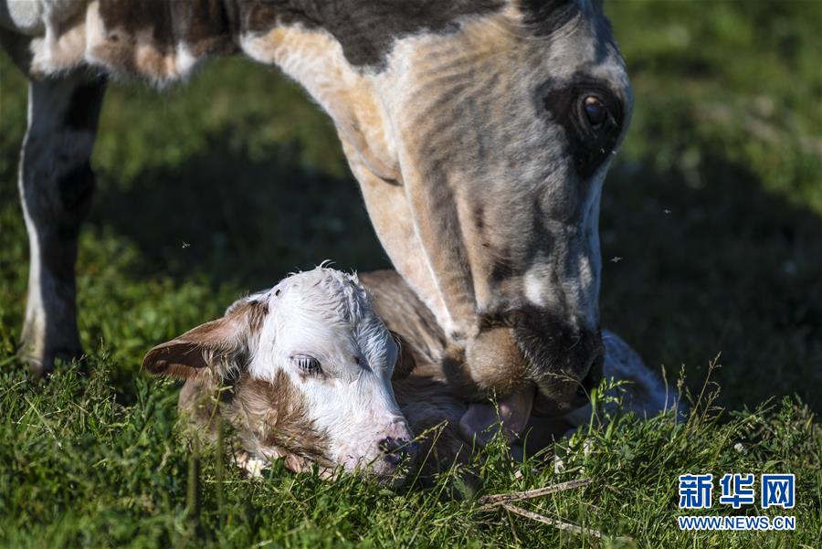 在新疆伊犁特克斯縣境內的夏牧場里,母牛在舔舐剛剛出生的牛犢(7月2日攝)。新華社記者 王菲 攝