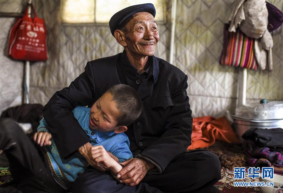 在新疆伊犁特克斯縣境內的夏牧場里,一位老人在帳篷內和孫子一起玩耍(7月1日攝)。新華社記者 王菲 攝