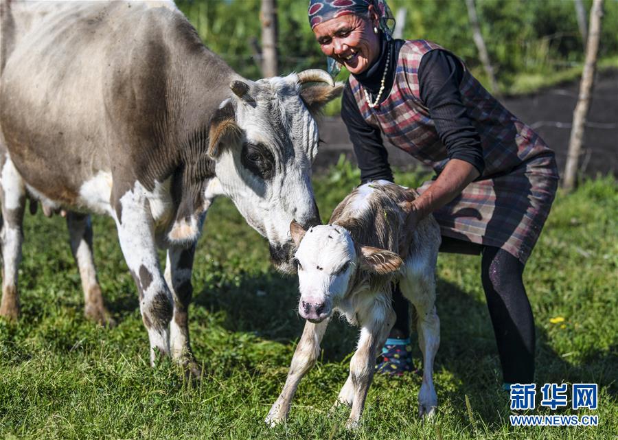 在新疆伊犁特克斯縣境內的夏牧場里,一位牧民幫助剛剛出生的牛犢站起來(7月2日攝)。新華社記者 王菲 攝