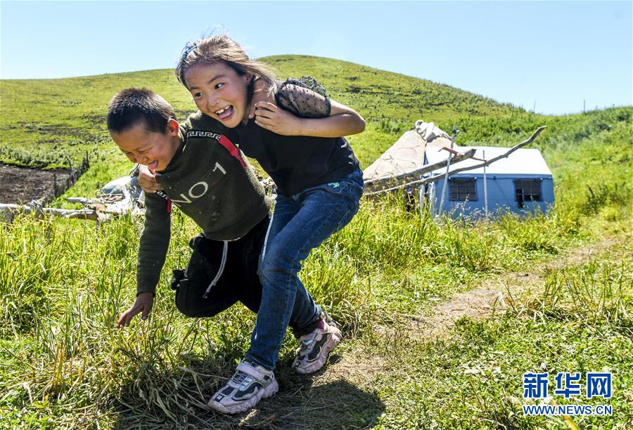在新疆伊犁特克斯縣境內的夏牧場里,兩名小朋友在玩耍(7月2日攝)。新華社記者 王菲 攝