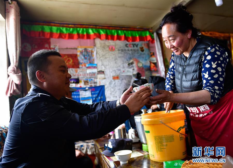 在可可西里不凍泉保護站周邊牧民家休息時,當?shù)啬撩窠o龍周才加準備酸奶(6月29日攝)。新華社記者 張龍 攝