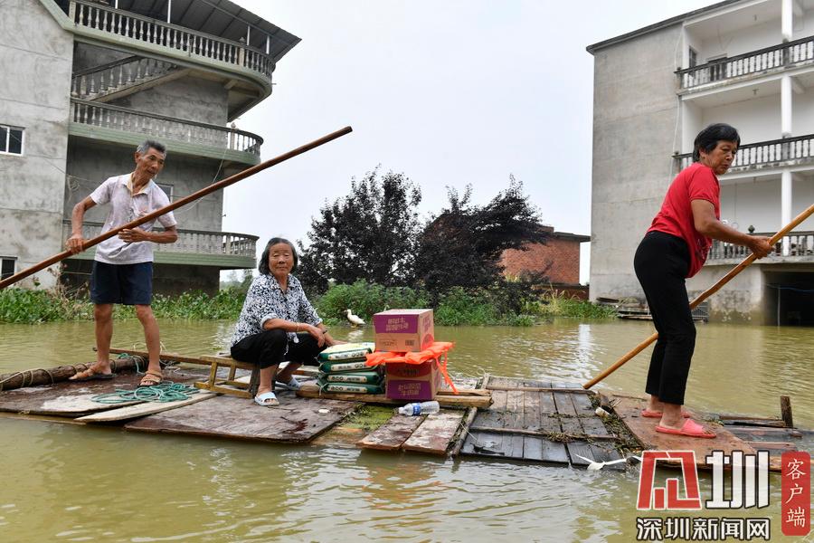 江西鄱陽(yáng)村莊洪水圍困 留守村民劃船外出取生活物資