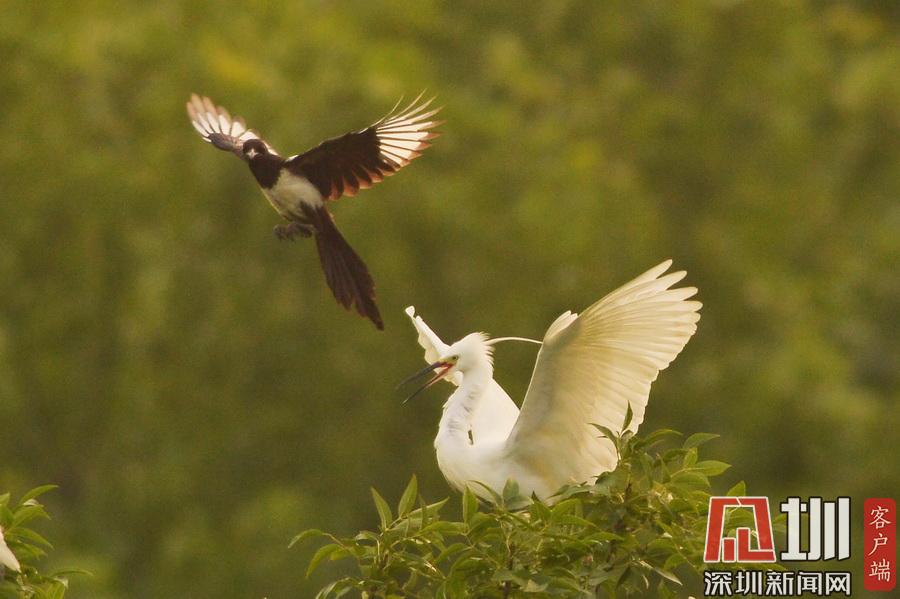 2020年7月14日,在山東省青島市城陽(yáng)區(qū)紅島街道一處林間,晚歸的白鷺與喜鵲在枝頭“蹁躚起舞”,優(yōu)美如畫(huà)。