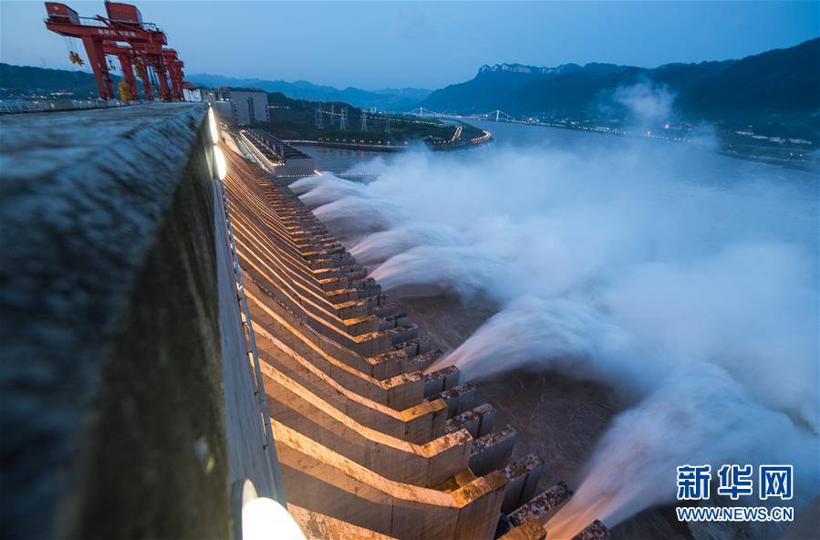 7月19日,三峽樞紐開啟泄洪深孔泄洪。19日20時(shí),三峽水庫入庫流量4.6萬立方米/秒,較本輪洪水的峰值6.1萬立方米/秒下降了1.5萬立方米/秒?!伴L江2020年第2號(hào)洪水”平穩(wěn)通過三峽大壩。新華社記者肖藝九攝