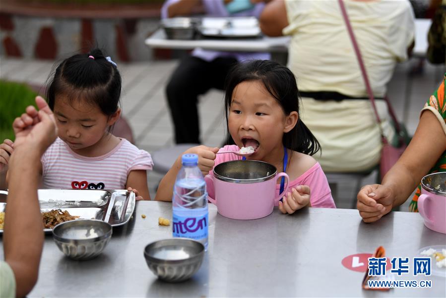 7月14日,小朋友在安徽省宿松縣洲頭鄉(xiāng)中心小學(xué)集中安置點(diǎn)吃晚餐。新華社記者劉軍喜攝