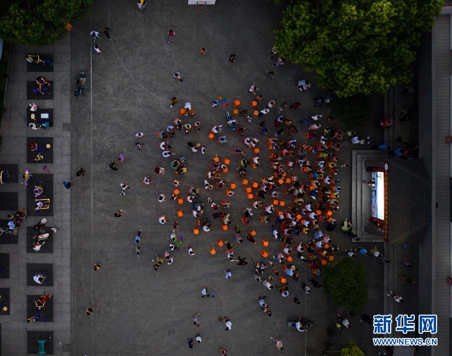 7月21日,“衛(wèi)家班皮影戲”劇團(tuán)的藝人們?cè)诤湍罉虼宓奈幕Y堂前為村民們上演傳統(tǒng)皮影戲,豐富鄉(xiāng)村百姓夏季文化生活(無(wú)人機(jī)照片)。新華社記者徐昱攝