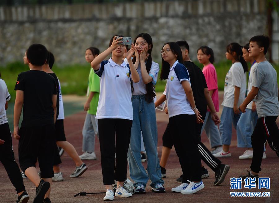 在融水苗族自治縣思源實驗學校舉辦的支教團送別晚會上,支教老師林洋港(中)和同學們合影留念(7月22日攝)。新華社記者黃孝邦攝