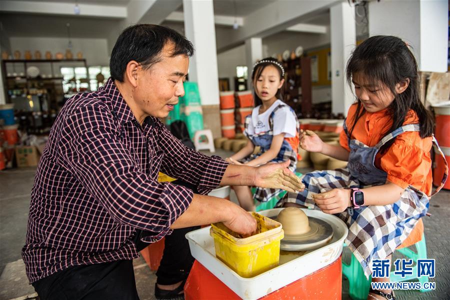 母先才在陶藝體驗(yàn)館里教小游客如何使用陶藝?yán)鳈C(jī)(7月14日攝)。新華社記者 陶亮 攝