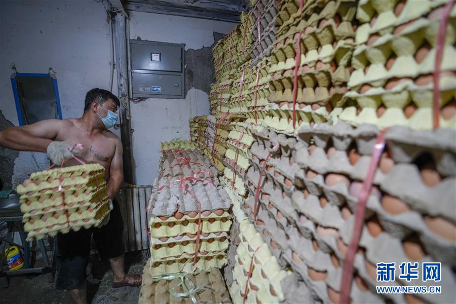 7月26日,在烏魯木齊新聯(lián)農(nóng)副產(chǎn)品綜合市場(chǎng)內(nèi),商販在擺放即將批發(fā)的雞蛋。新華社記者 趙戈 攝