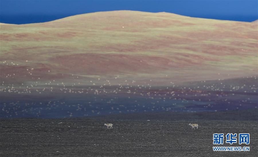 這是7月7日在可可西里卓乃湖區(qū)域拍攝的兩只藏羚羊,后面的山坡上有大群覓食的藏羚羊。新華社記者張龍攝