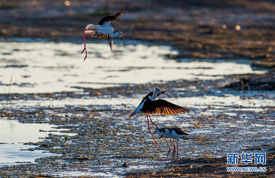 7月28日,在鄂爾多斯?jié)竦靥伊R—阿拉善灣海子,兩只長(zhǎng)腳鷸在爭(zhēng)斗。鄂爾多斯?jié)竦匚挥趲?kù)布齊沙漠、毛烏素沙地接壤地帶,2002年被列入國(guó)際重要濕地名錄。從2006年開(kāi)始,由于濕地湖面萎縮、湖心島消失,在此筑巢繁殖的世界瀕危物種遺鷗幾近消失。近年來(lái),當(dāng)?shù)夭扇《喾N治理措施,濕地生態(tài)環(huán)境逐步好轉(zhuǎn)。2019年起,濕地內(nèi)的桃力廟—阿拉善灣海子迎來(lái)遺鷗大規(guī)模“回歸”。如今,40多種鳥(niǎo)類(lèi)在此棲息,鄂爾多斯?jié)竦刂匦鲁蔀轼B(niǎo)類(lèi)的樂(lè)園。新華社記者連振攝
