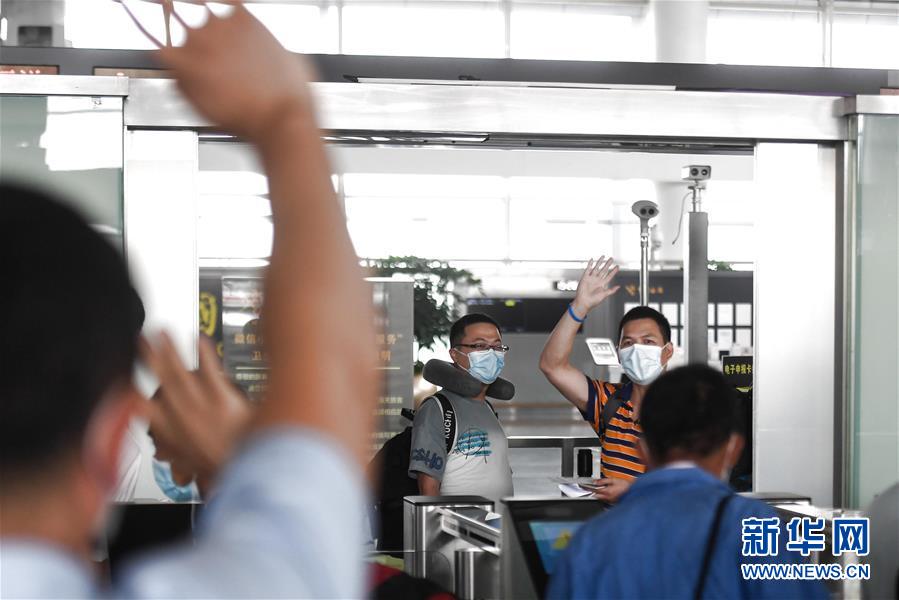 7月29日,在杭州蕭山國(guó)際機(jī)場(chǎng),電力工程技術(shù)人員走入安檢通道后與送行人員揮手告別。當(dāng)日,中國(guó)能源建設(shè)集團(tuán)浙江火電建設(shè)有限公司的113名電力工程技術(shù)人員在杭州蕭山國(guó)際機(jī)場(chǎng)集結(jié),啟程飛赴印度尼西亞首都雅加達(dá)。他們將重新投入到印尼多個(gè)“一帶一路”重點(diǎn)工程的建設(shè)中。新華社記者黃宗治攝
