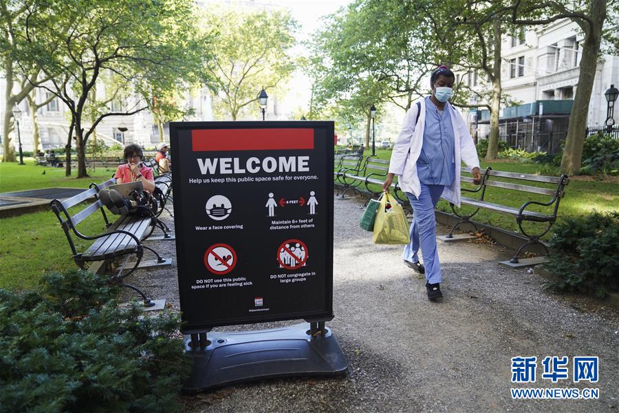 7月29日,在美國紐約,一名女子從公園內的防疫提示牌旁走過。美國約翰斯·霍普金斯大學實時統(tǒng)計數(shù)據(jù)顯示,截至29日,美國累計新冠確診病例已超過440萬例,累計死亡病例超過15萬例。新華社記者王迎攝