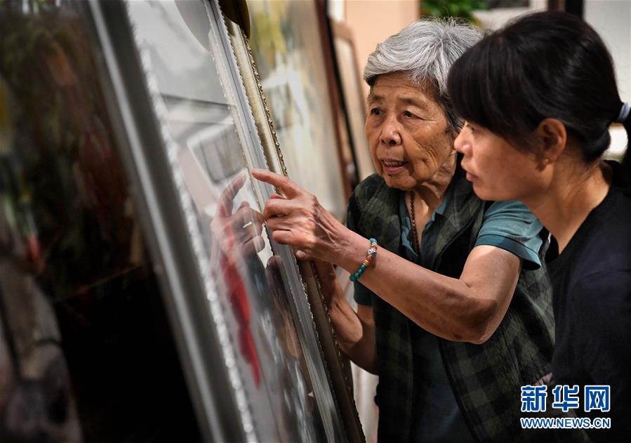 在開封市素花宋繡工藝有限公司的展示館里,王素花向徒弟劉冬紅講解刺繡作品上的難點(diǎn)(7月30日攝)。新華社記者李安攝