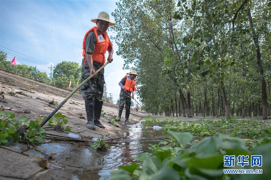 8月5日,夏德勤(左)與同事在長江武金堤上巡查。新華社記者肖藝九攝