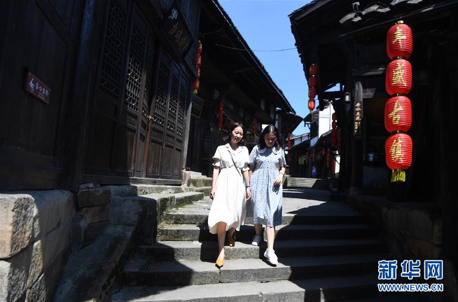 8月5日,游客在豐盛古鎮(zhèn)游覽。近年來(lái),重慶市巴南區(qū)引入社會(huì)資本,按照“修舊如舊、適度開發(fā)”的原則對(duì)豐盛古鎮(zhèn)進(jìn)行保護(hù)性修繕和景區(qū)化打造,讓古鎮(zhèn)在保留原有歷史人文風(fēng)貌的同時(shí),煥發(fā)新活力。新華社記者王全超攝