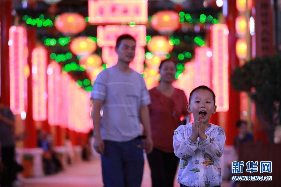 7月15日,人們?cè)谥矍h老縣城的步行街上散步。