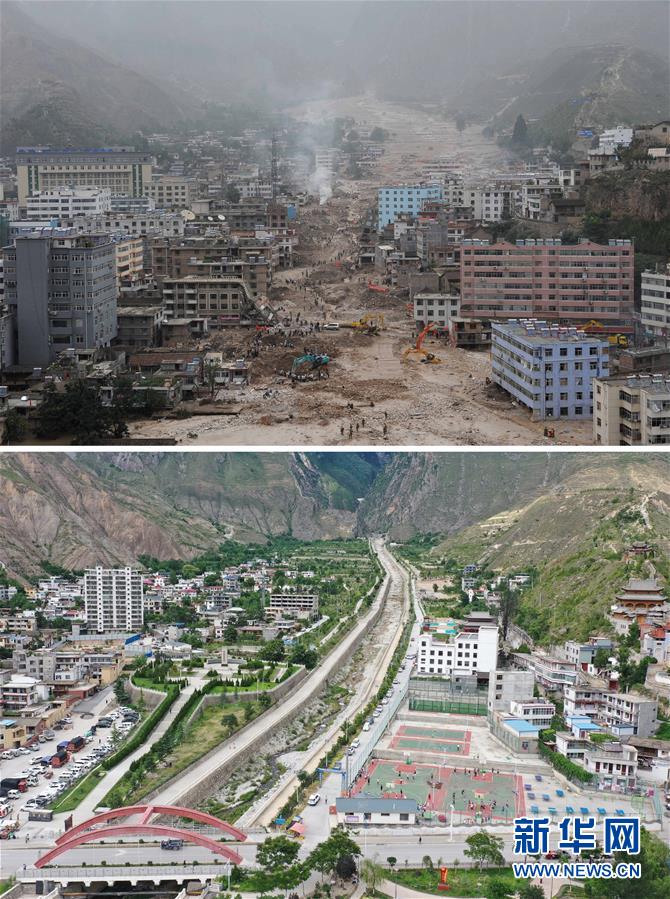 拼版照片:上圖為2010年8月13日拍攝的舟曲特大山洪泥石流災(zāi)害受災(zāi)核心區(qū)域(新華社記者王鵬攝);下圖為2020年7月15日用無人機(jī)拍攝的位于受災(zāi)核心區(qū)域的三眼峪山洪泥石流排導(dǎo)渠(新華社記者杜哲宇攝)。新華社發(fā)