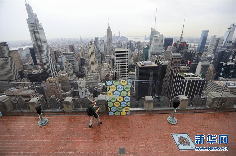 8月6日,在美國紐約,一名攝影師在洛克菲勒中心觀景臺上參觀。當(dāng)日,3月份暫時關(guān)閉的洛克菲勒中心觀景臺恢復(fù)對公眾開放。每天13時至21時,人們可戴口罩前往參觀。新華社記者王迎攝