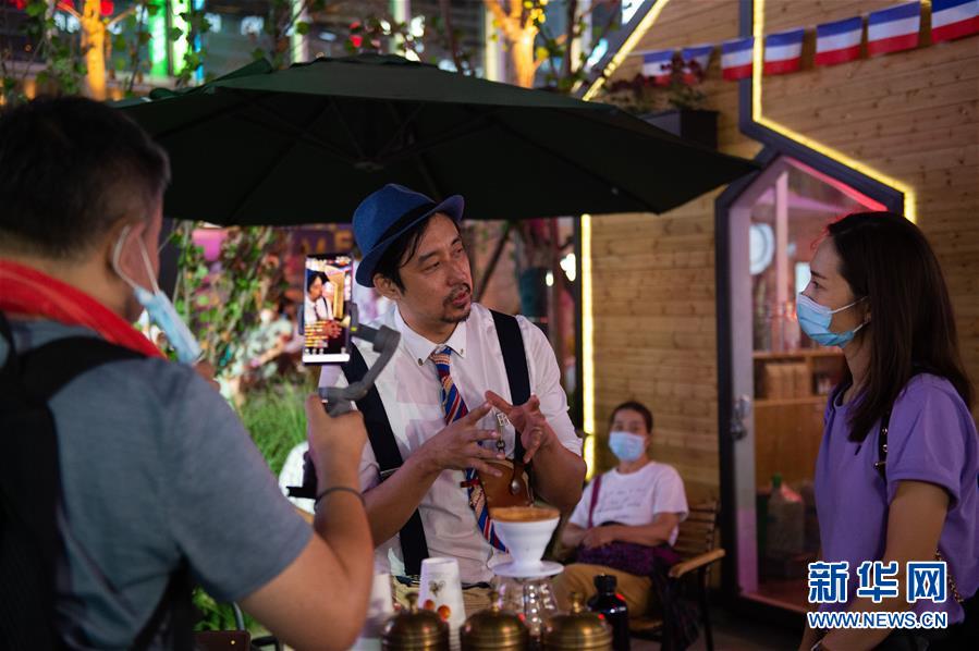 8月8日晚,望京小街商業(yè)街上一家咖啡店的工作人員(中)在接受網絡直播采訪。新華社記者 陳鐘昊 攝