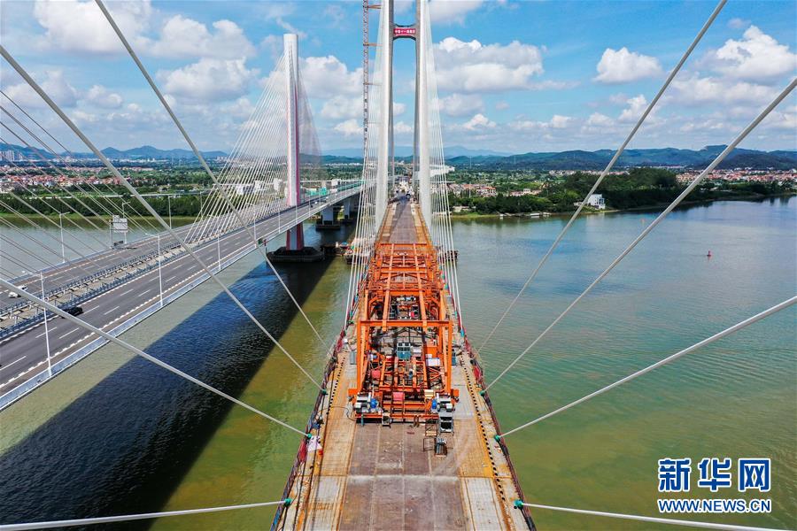 8月9日拍攝的廣州南沙港鐵路跨西江特大斜拉橋最后一塊鋼箱梁吊裝施工現(xiàn)場(chǎng)(無(wú)人機(jī)照片)。當(dāng)日,中鐵十一局承建的粵港澳大灣區(qū)基礎(chǔ)設(shè)施“硬聯(lián)通”重點(diǎn)工程——廣州南沙港鐵路跨西江特大斜拉橋完成最后一塊鋼箱梁吊裝作業(yè),大橋即將合龍。該橋位于廣東佛山市和江門市交界處,全長(zhǎng)1117.5米。新華社記者劉大偉攝。