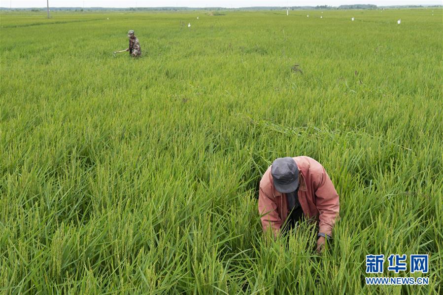 8月11日,農民在撫遠市一處稻田中清除雜草。時下,“華夏東極”黑龍江省撫遠市的水稻長勢良好,蒼翠的稻田一望無際,猶如綠毯鋪在大地上。新華社記者謝劍飛攝。