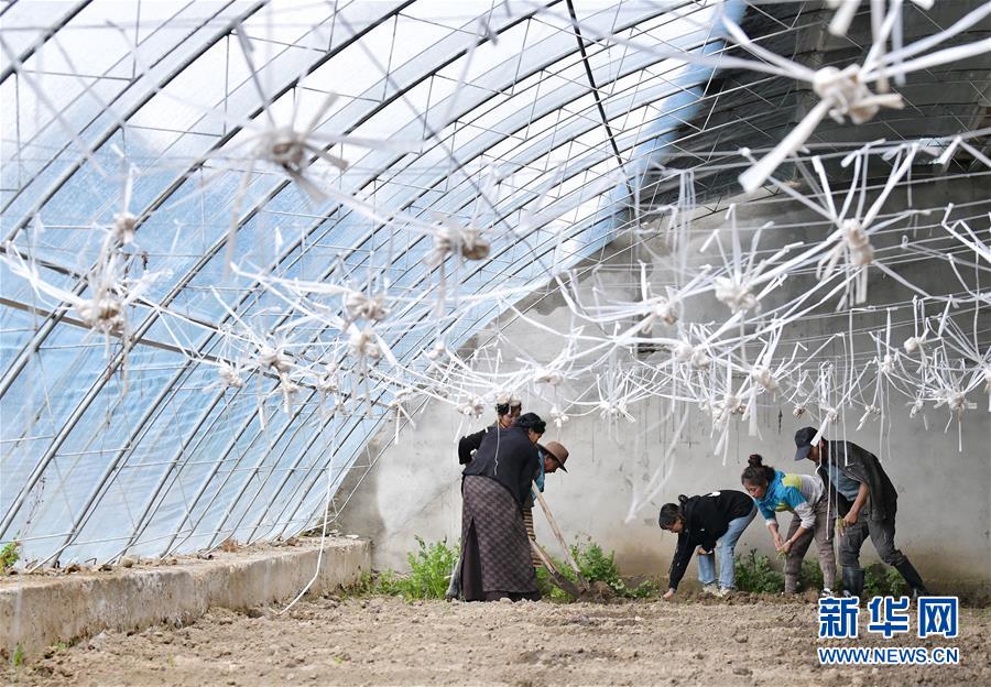 格桑旺姆(右三)與姐姐德吉卓瑪(右二)帶領(lǐng)工人在蔬菜大棚內(nèi)翻地,準(zhǔn)備種新的蔬菜(8月3日攝)。新華社記者 李賀 攝