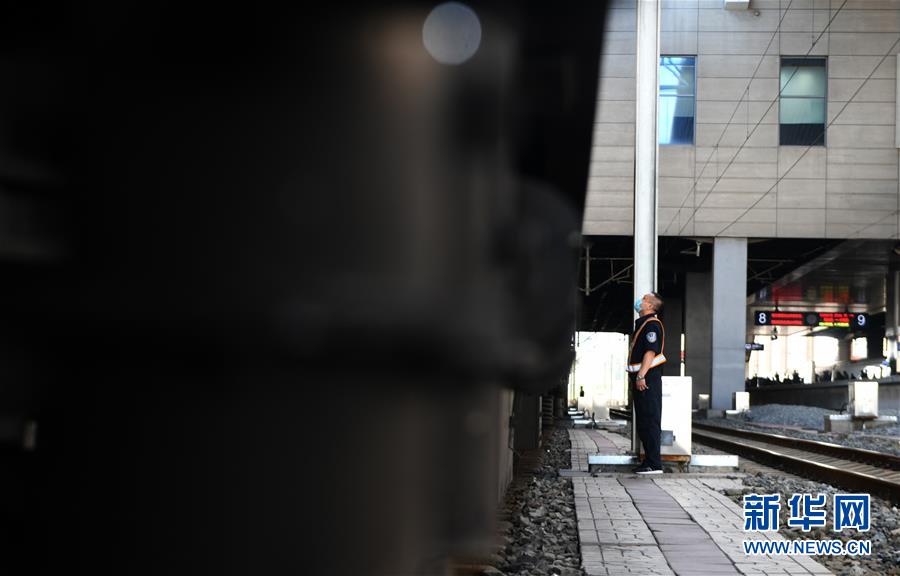 8月12日,長春火車站客運車間上水工常明結(jié)束上水工作后等候列車出站。新華社記者 林宏 攝