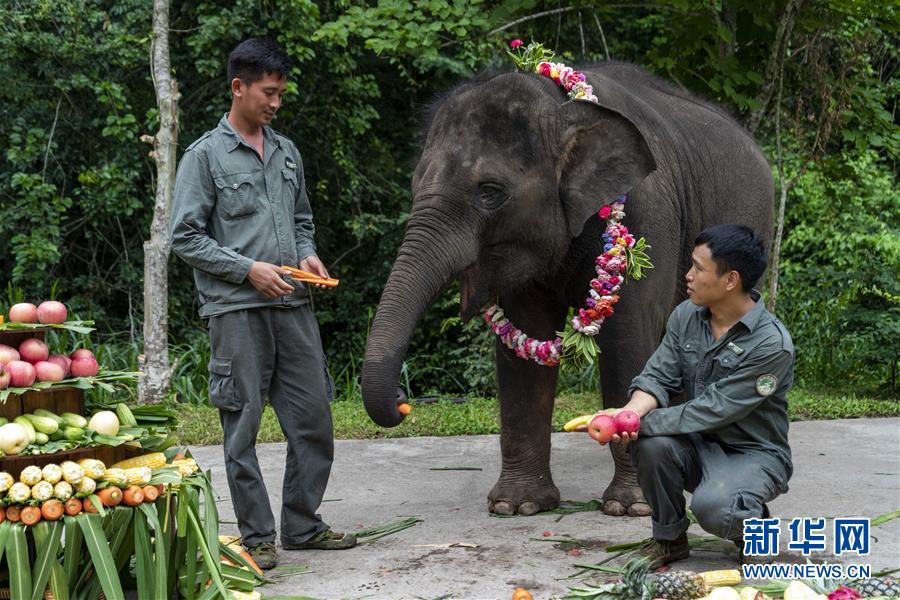 8月12日,在西雙版納傣族自治州亞洲象種源繁育及救助中心,兩名“象爸爸”在喂救助象“羊妞”吃“生日蛋糕”。新華社記者 陳欣波 攝