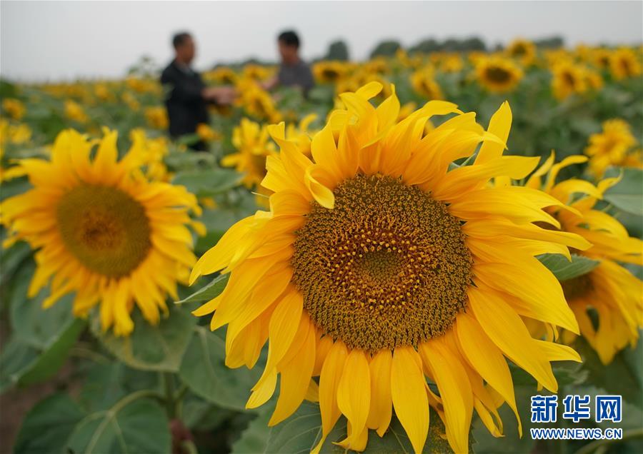 8月12日,在尚義縣三工地鎮(zhèn)有德元村,農(nóng)民在田間管護旱作油葵。新華社記者 楊世堯 攝