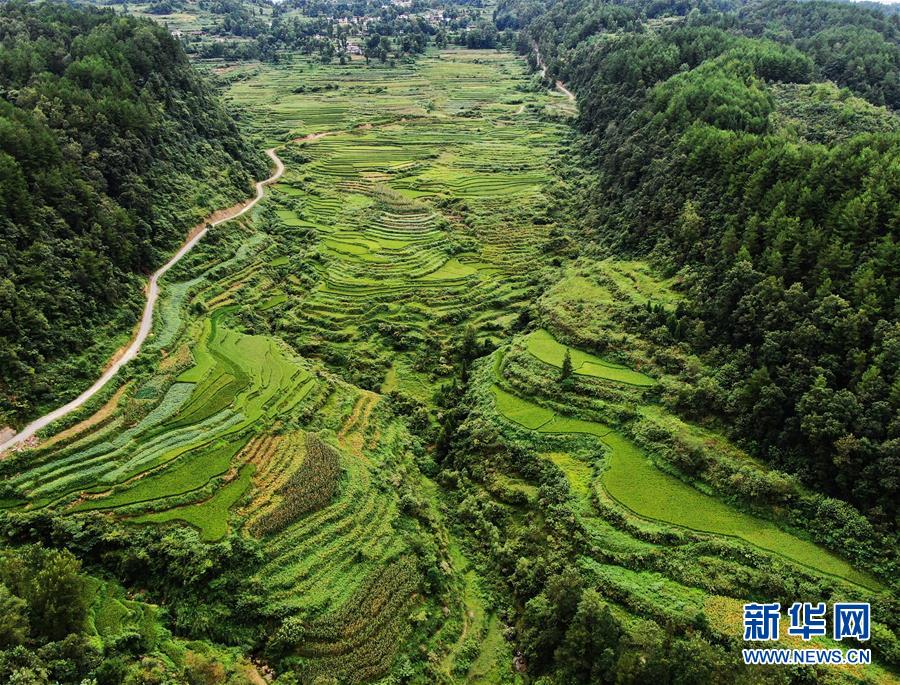 這是8月13日拍攝的鞍子鎮(zhèn)大林村梯田景色(無(wú)人機(jī)照片)。時(shí)下,重慶市彭水苗族土家族自治縣鞍子鎮(zhèn)大林村的梯田景色迷人,構(gòu)成一幅幅山鄉(xiāng)田園美景。新華社記者王全超攝