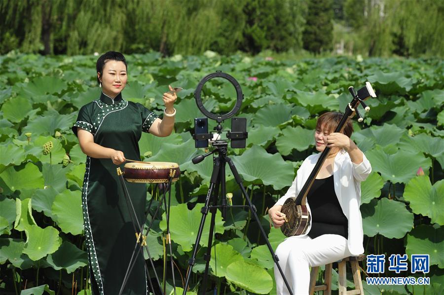 8月13日,河北省河間市西河大鼓非遺項目藝人李雪(左)、張領娣通過網(wǎng)絡直播表演西河大鼓。暑假期間,河北省河間市文化館推出非遺展演“云端”播系列活動,組織當?shù)匚骱哟蠊姆沁z項目傳承人利用視頻直播的方式進行線上展演,通過“云端”傳承非遺文化。新華社記者朱旭東攝
