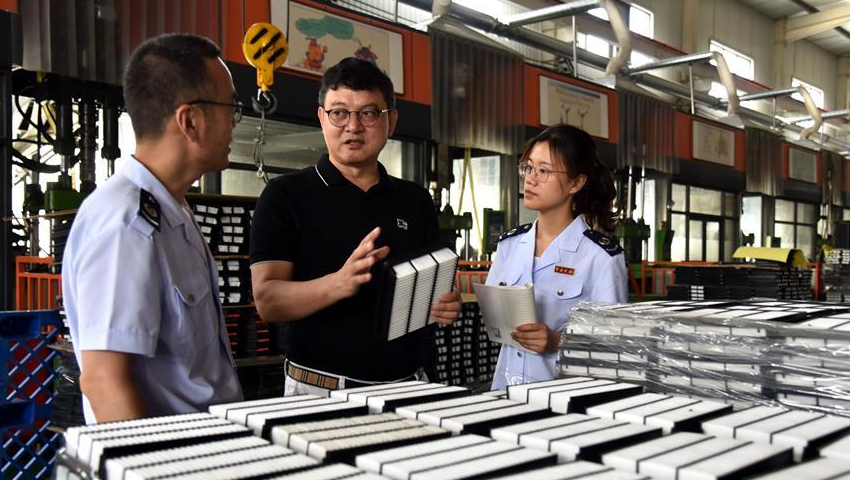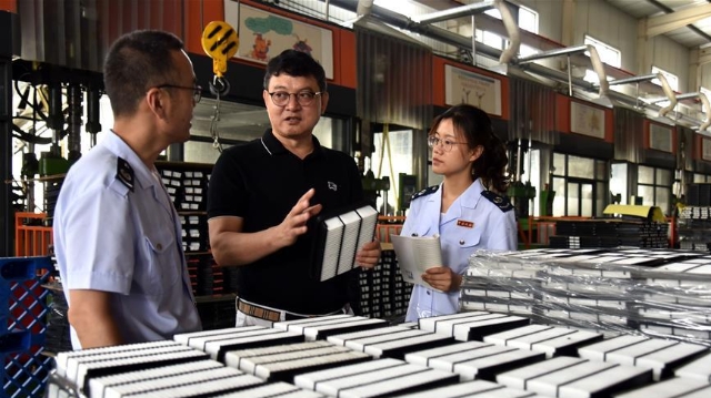 6月15日,稅務工作人員在河北省邢臺市威縣一家汽車配件生產企業(yè)調研稅費政策落實情況。