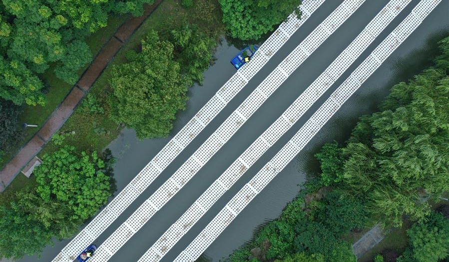 在益陽市大通湖區(qū)東大堤附近水域,一艘船采取“以船代倉”方式儲備防汛物資。