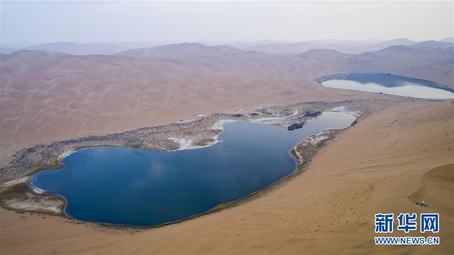 沙丘起伏的曲線陡變成高聳的沙山,碧藍的湖泊散落在沙海間。
