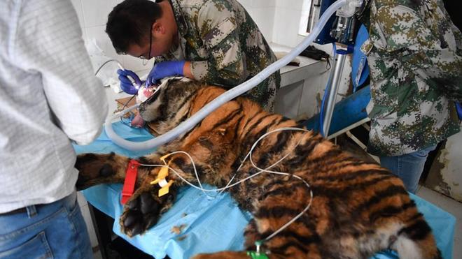 云南野生動(dòng)物園為百獸之王洗牙齒
