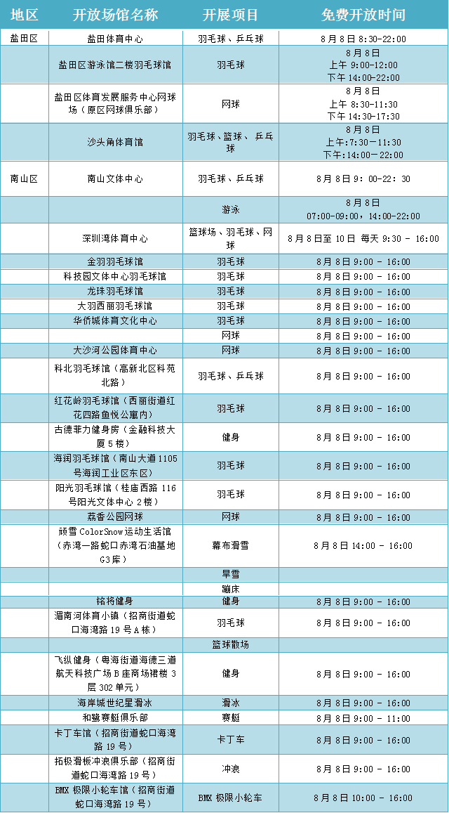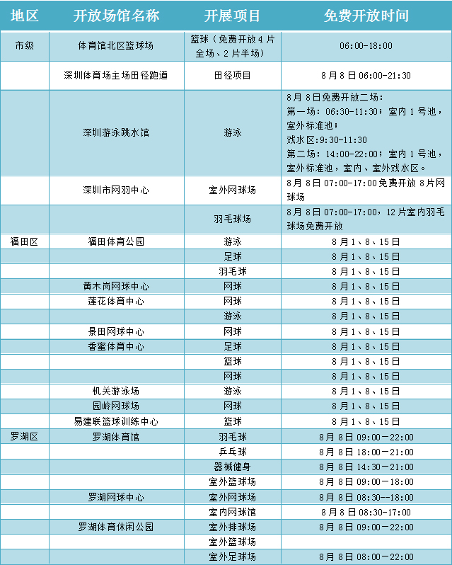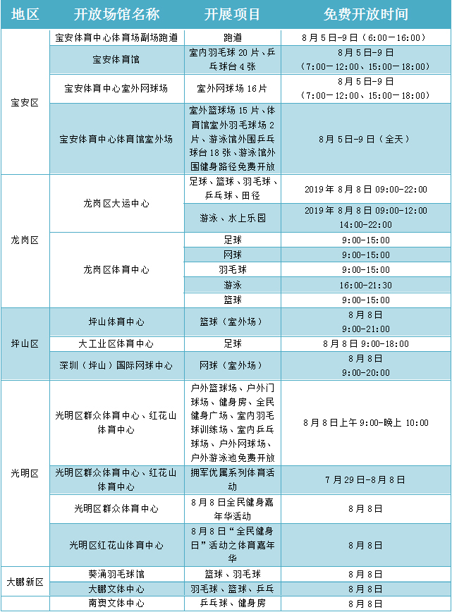 在“全民健身日”期間,深圳舉辦“全民健身嘉年華”及各類市級健身賽事活動16場,各區(qū)、各相關(guān)單位也結(jié)合實際,組織推出80余場全民健身運動,如面向全市市民的大型國民體質(zhì)監(jiān)測和健身咨詢活動、全民健身大講堂活動等。各級社會體育指導(dǎo)員也將開展義務(wù)健身輔導(dǎo),利用豐富的體育專業(yè)技能,向廣大群眾講解健身知識,推廣健身方法,普及科學(xué)健身理念,為全民健身活動提供技術(shù)指導(dǎo)服務(wù)。8月8日“全民健身日”當天,深圳市體育中心以及各區(qū)體育場館,也將免費向市民或單位開放。