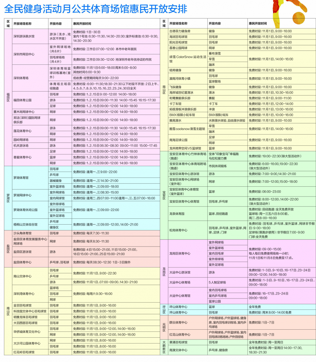 全市各區(qū)的公共體育場館、體育設(shè)施和學(xué)校體育場地也將免費或優(yōu)惠向市民開放,以滿足廣大群眾的健身需求,豐富群眾體育文化生活,吸引更多人群參加健身活動。值得注意的是,在今年免費開放的體育場館中,不但有市區(qū)級建設(shè)的大型體育中心、體育館,更有如機(jī)關(guān)游泳館、華僑城體育中心、古德菲力健身房等幾十余家社會體育場館,政府主導(dǎo),社會力量融入,全民健身范圍得以大幅擴(kuò)大。