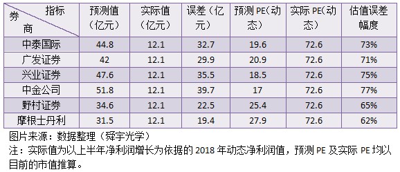 舜宇光學(xué)的市值為998億港元,僅為騰訊的3%,騰訊波動一個點(diǎn)的市值,就相當(dāng)于舜宇光學(xué)波動33.3%,肯定比不了。不過以打臉的程度來說,舜宇光學(xué)有點(diǎn)過了,預(yù)測值與實(shí)際值的估值誤差達(dá)70%左右,這臉打的確實(shí)響。