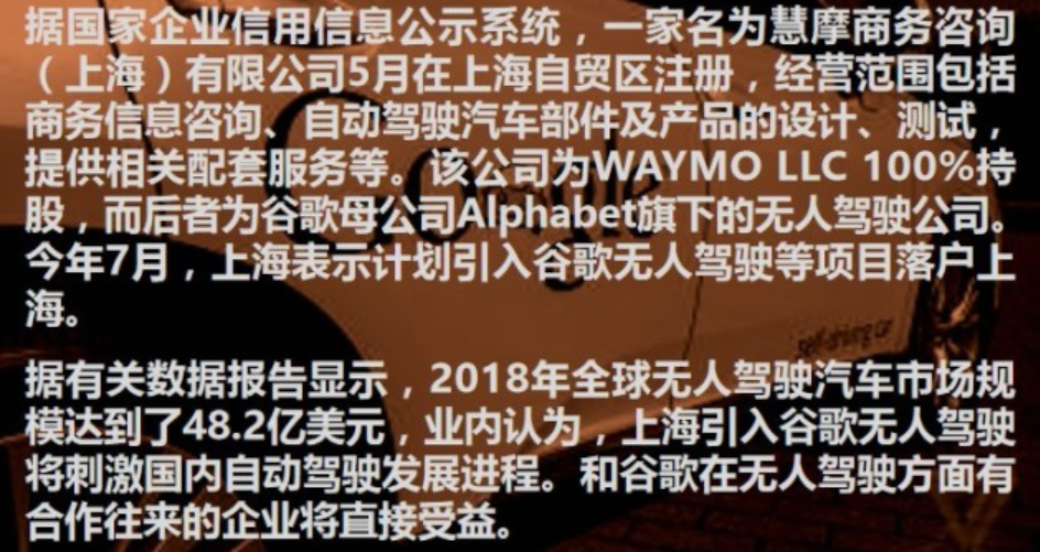 谷歌母公司Alphabet旗下研究自動駕駛的部門Waymo在自動駕駛領(lǐng)域處于全球領(lǐng)先水平,當前其已經(jīng)完成800萬英里(約1287萬公里)自動駕駛汽車公共道路測試,模擬測試里程達到50億英里(約80.47億公里)。Waymo計劃在為今年下半年向部分地區(qū)的美國消費者推出無人駕駛服務(wù)。
