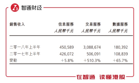 板塊方面,交易板塊是此次營收貢獻(xiàn)的主力軍,共為總營收貢獻(xiàn)81.5%的銷售收入。上半年,交易服務(wù)板塊營收入約30.9億人民幣,較去年5.06億增長(zhǎng)約510%。信息服務(wù)板塊營收約人民幣4.5億,同比增長(zhǎng)5.8%。數(shù)據(jù)服務(wù)板塊則貢獻(xiàn)營業(yè)收入約1.81億元人民幣,較去年1.09億增長(zhǎng)66%。利潤(rùn)率方面,信息服務(wù)增長(zhǎng)7.12%,交易服務(wù)增長(zhǎng)188.5%,數(shù)據(jù)服務(wù)增長(zhǎng)23.45%。