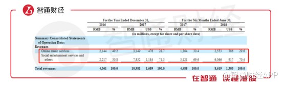 可以看到,2017年上半年,公司在線音樂服務與以音樂為核心的社交娛樂服務分別占到總收入的28.7%和71.3%,而在2018年上半年,這兩個數值為29.6%和70.4%。也就是說,社交娛樂服務為騰訊音樂的“核心業(yè)務”。