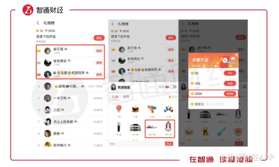 在用戶進入K歌界面后,除了K歌按鍵還有就是歌曲榜單,這些榜單記錄的是該歌曲翻唱獲得禮物數的排行情況。翻唱歌手被打賞的禮物越多,榜單排名越高,禮物則是靠用戶通過現金兌換而來。與直播打賞類似,全民K歌也是通過用戶購買虛擬禮物進行變現。